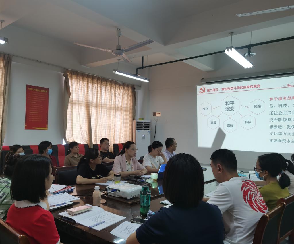 陈欣表示,意识形态工作在党和国家事业发展全局中居于极端重要地位,关乎政党存续、国家安全和民族兴衰,关乎中国特色社会主义的道路坚定性、旗帜鲜明性和方向正确性。她结合鲜活事例、当前国际热点事件和话题,分析了我国意识形态工作面临的严峻形势,突出意识形态工作在政治、经济和生活等方面的重要作用。她要求全体党员要树牢“四个意识”,坚定“四个自信”,坚决做到“两个维护”,进一步学习贯彻习近平新时代中国特色社会主义思想和党的十九届六中全会精神,坚持不懈领悟“两个确立”的决定性意义。作为高校老师要充分发挥“思政课程+”课程思政的主渠道育人作用 ;更加注重文化建设,践行社会主义核心价值观;要运用新媒体新技术使工作活起来;努力提升自我及员工思想政治素质。