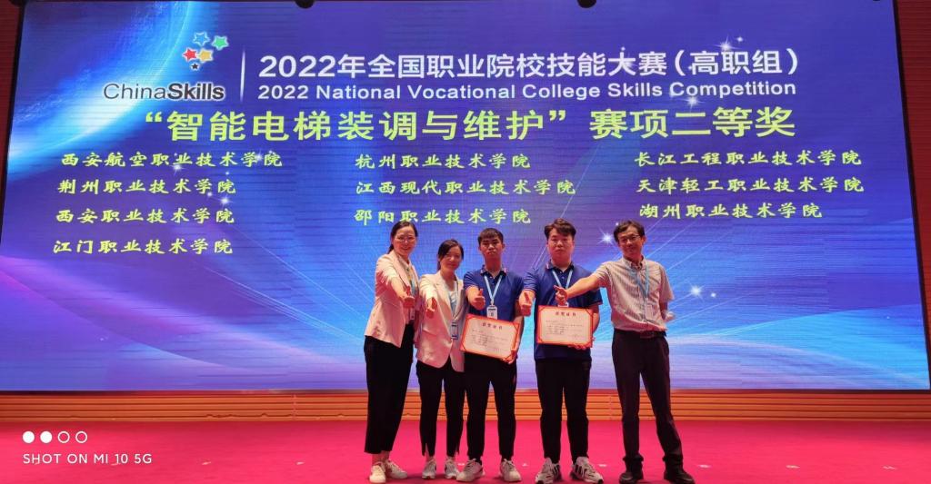 五个月以实训室为家,上完课后就开始训练; 40度的高温下衣服干了又湿,一天消耗一箱水,忙起来老师就睡在木板床上,陪着员工训练。8月24日,徐瑞民、董春生在全国职业院校技能竞赛(高职组)“智能电梯装调与维护赛项中,从51支队伍中脱颖而出,荣获二等奖。